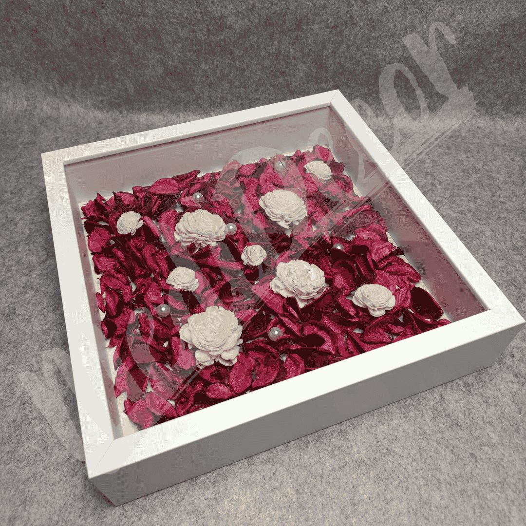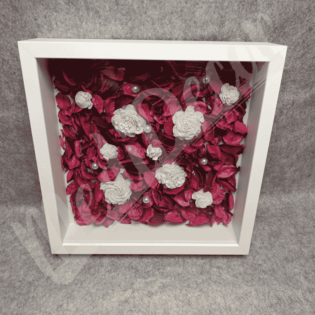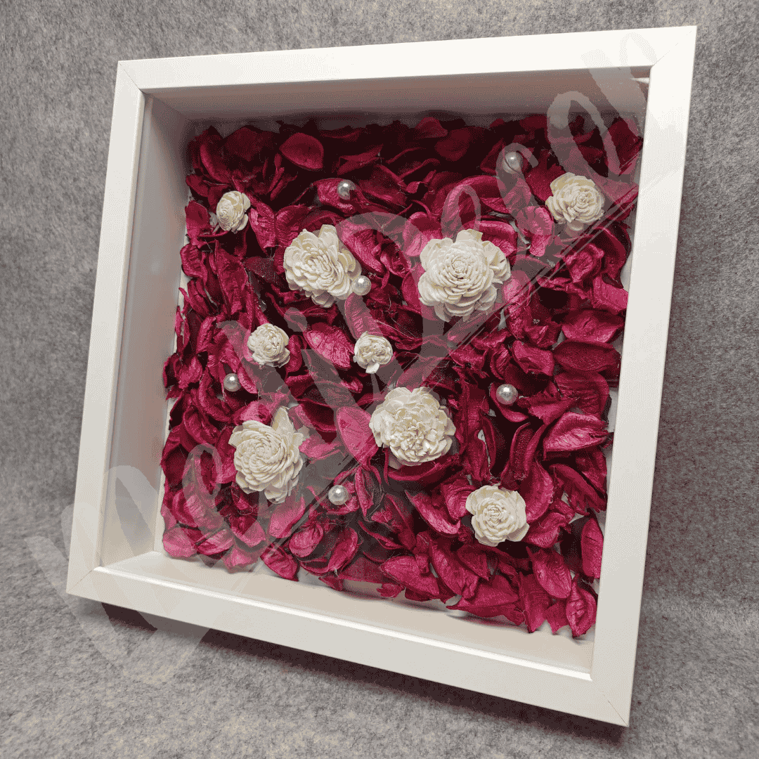 Képkeretbe álmodott termés dekoráció. 25×25 cm-es képkeretben apróbb termésekkel kirakott kép, melyet gyöngyök és natúr színű kis virágok díszítenek. A termések rózsaszín színűek.