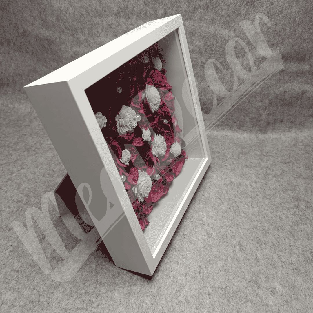 A fehér képkeret 25×25 cm-s, a hátulján támasztó és akasztó is van, illetve a keret szélessége miatt a keret szélén is megáll.