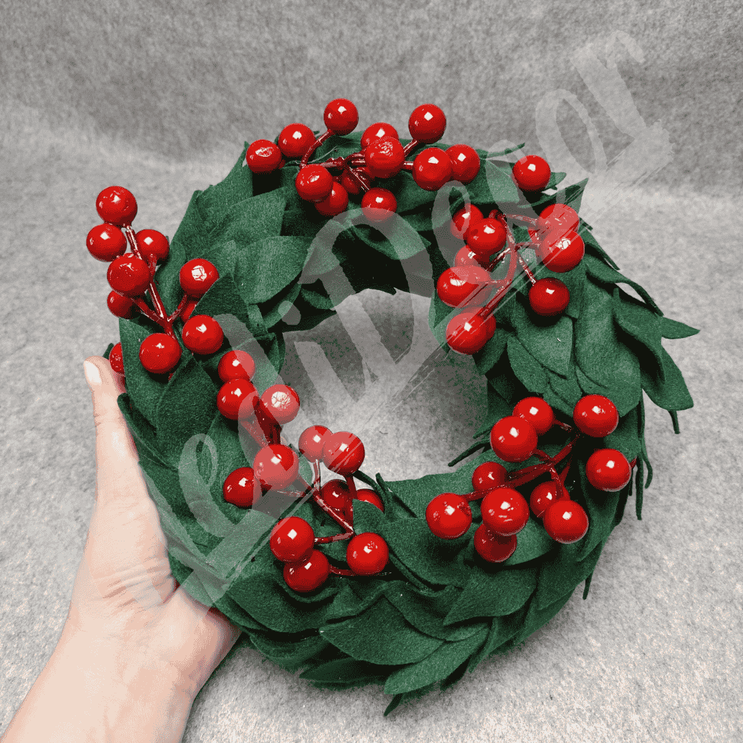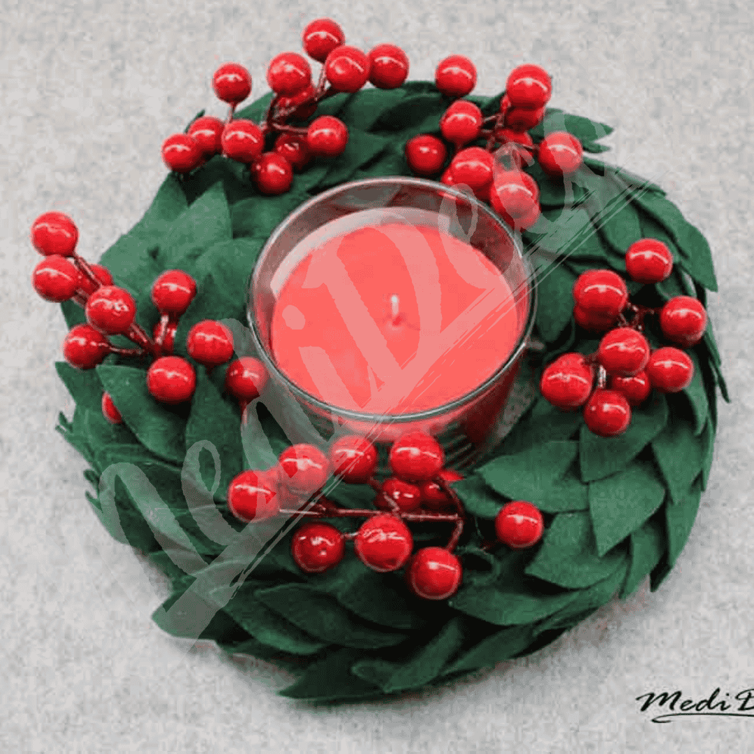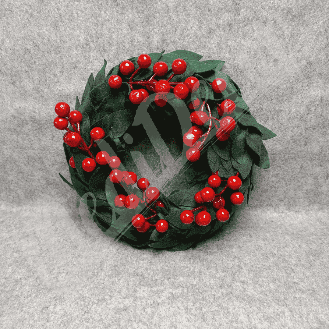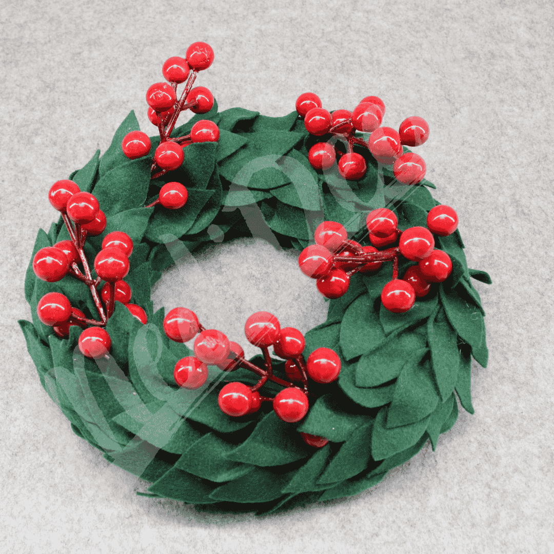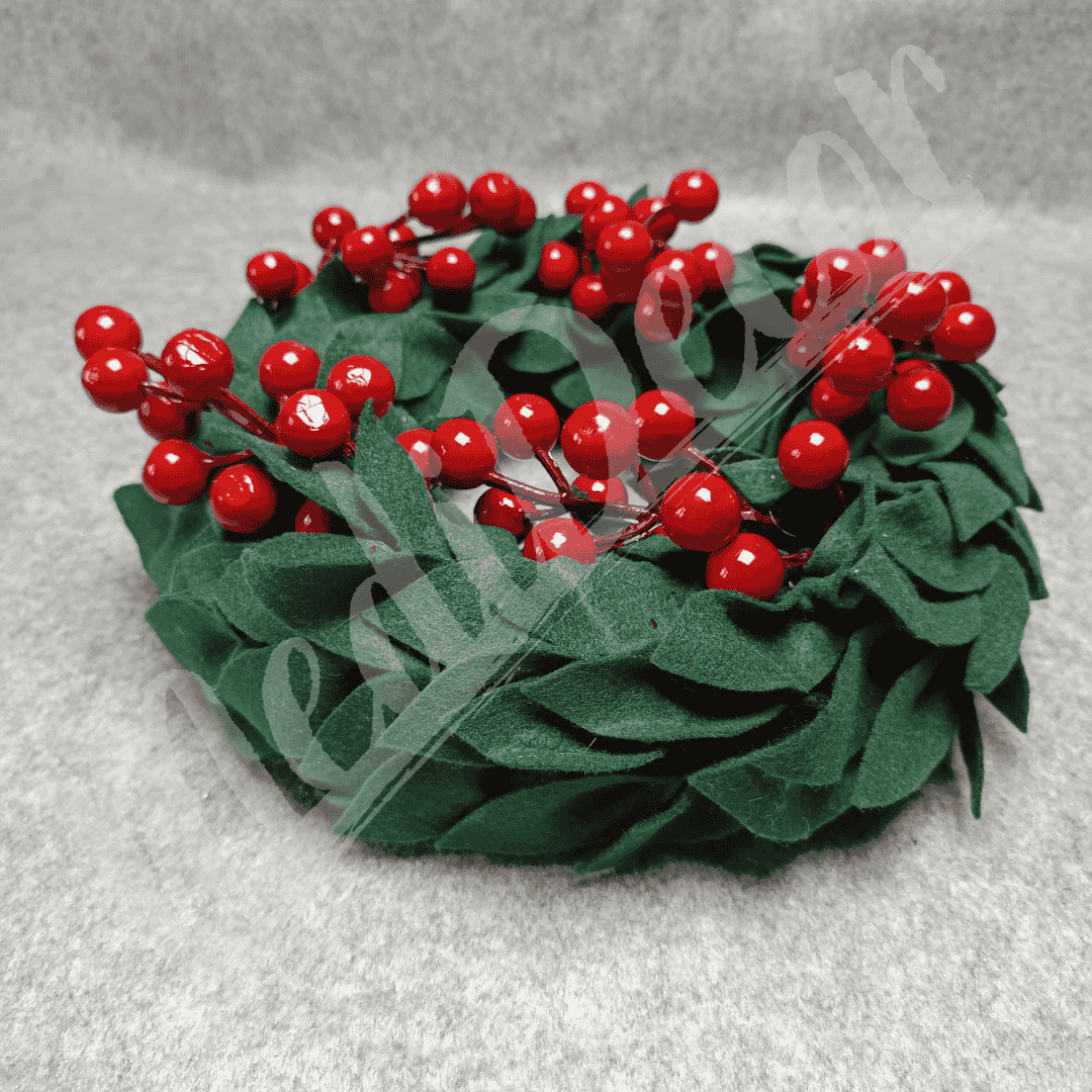 Sötétzöld filc levelekből készült asztali koszorú, melyet piros fényes bogyós virág díszít.