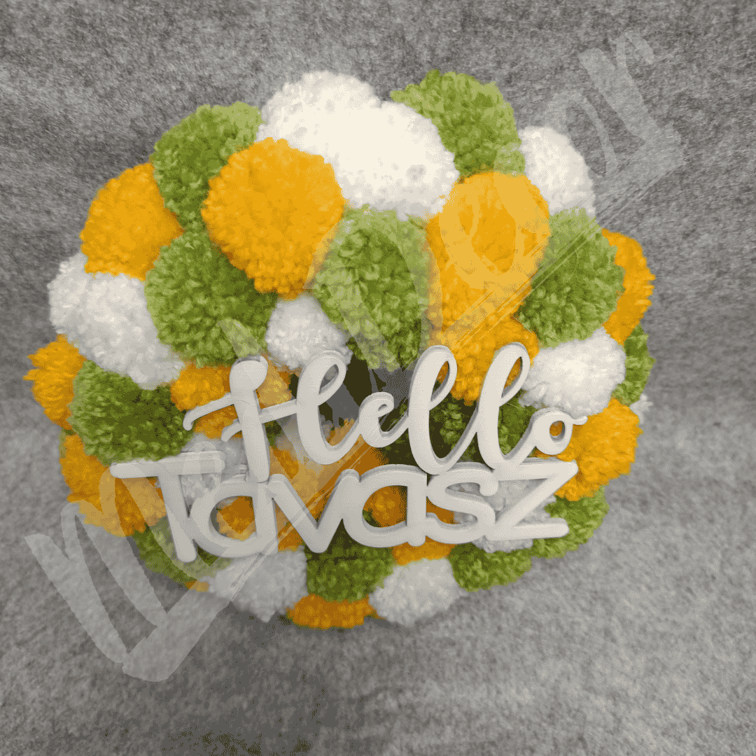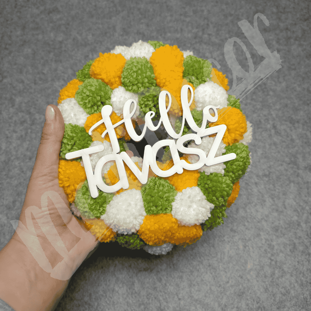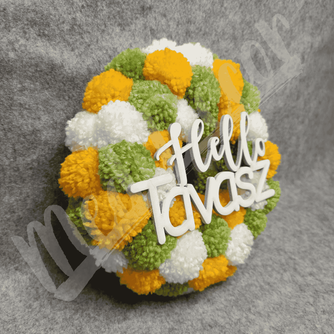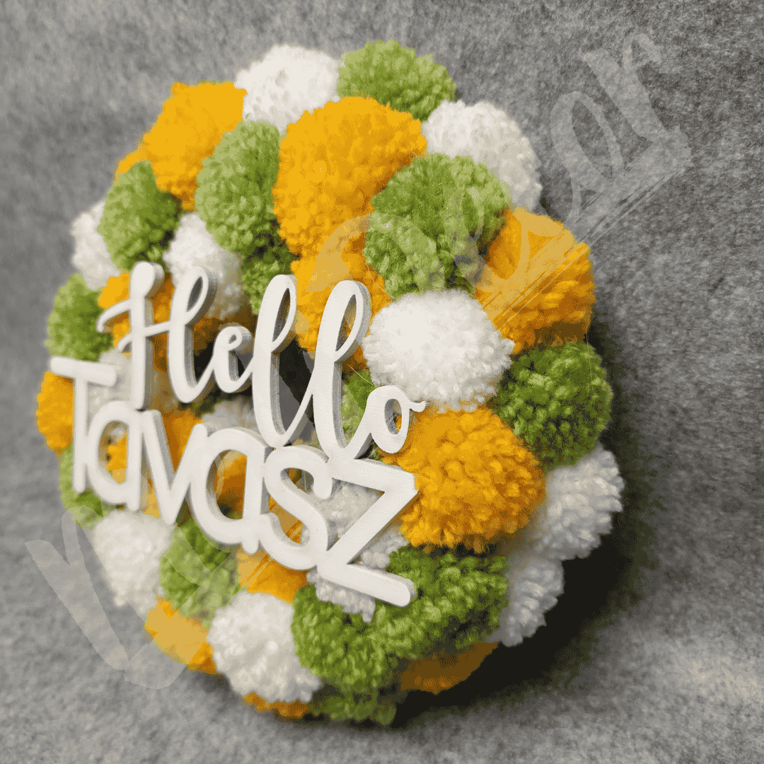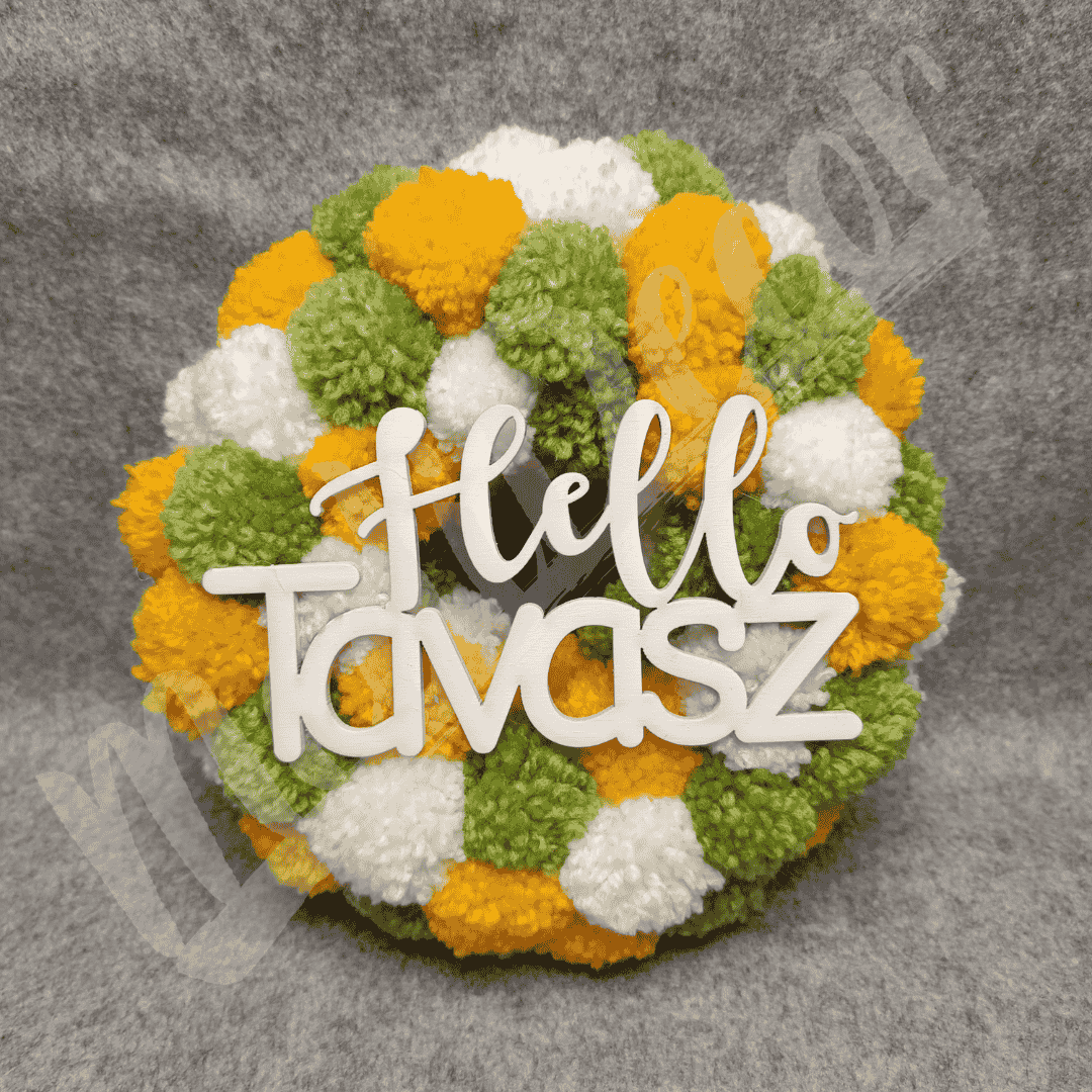 Vidám, tavasz színeit magán viselő pompon koszorú, ajtókopogtató. Fehér, sárga és zöld színeivel repít minket a tavaszba.