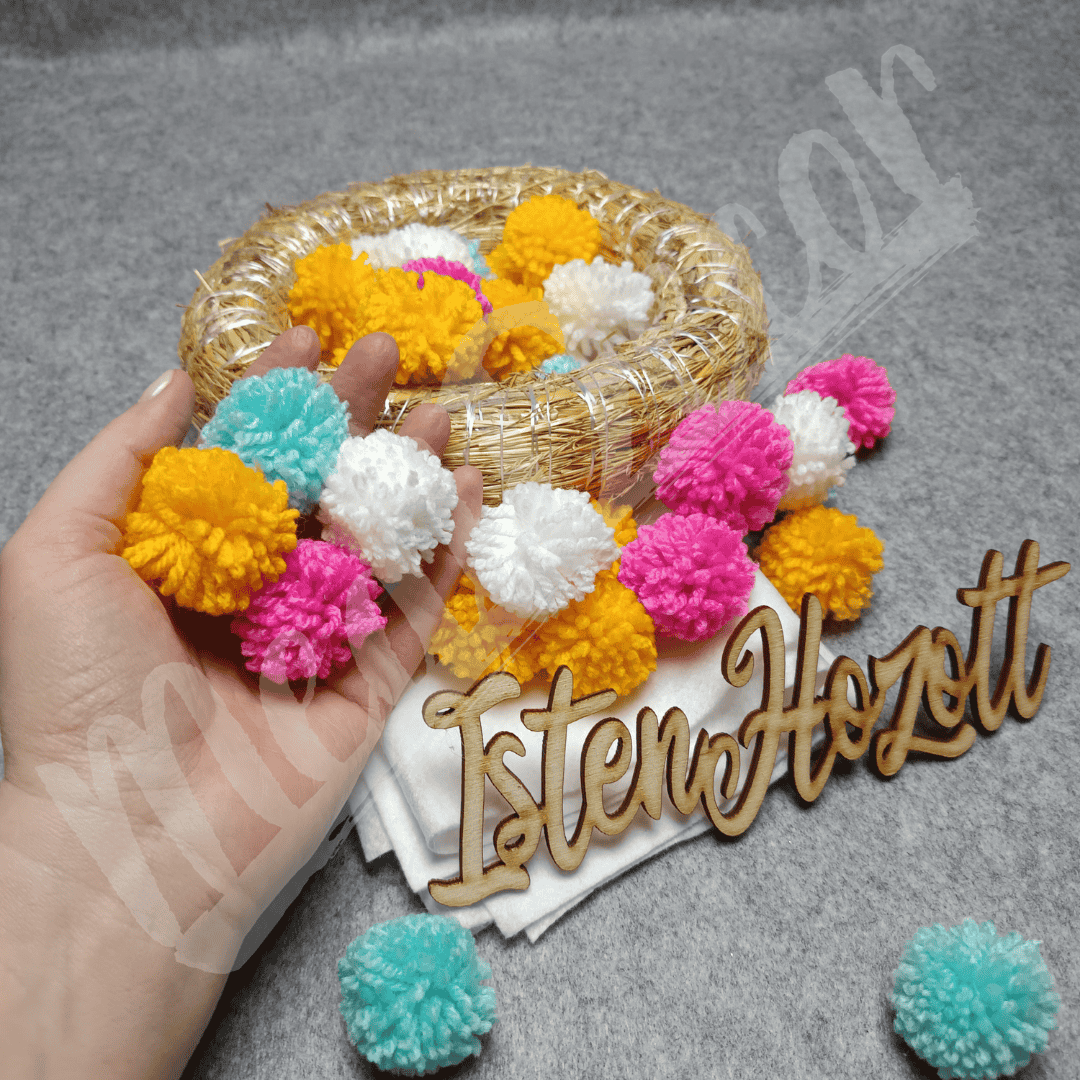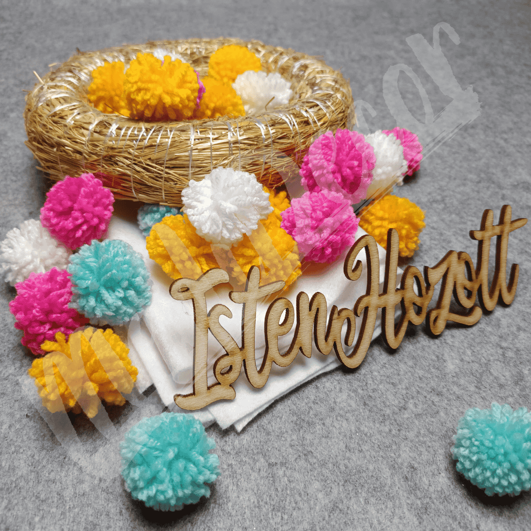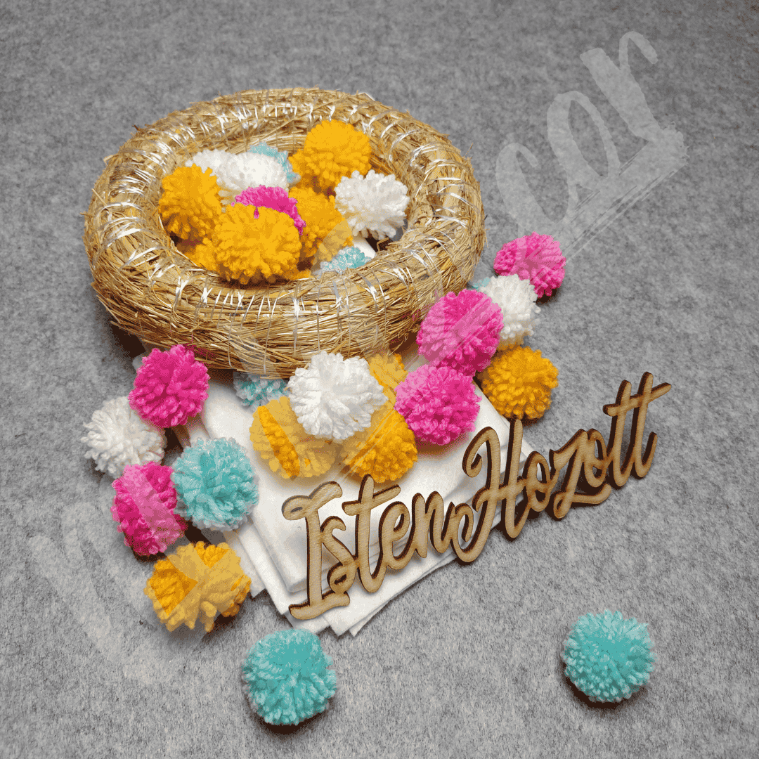 A csomag 20 cm-es koszorúalapot, az elkészített pomponokat, filc anyagot és fa feliratot tartalmaz + extra az online kurzushoz való hozzáférés.