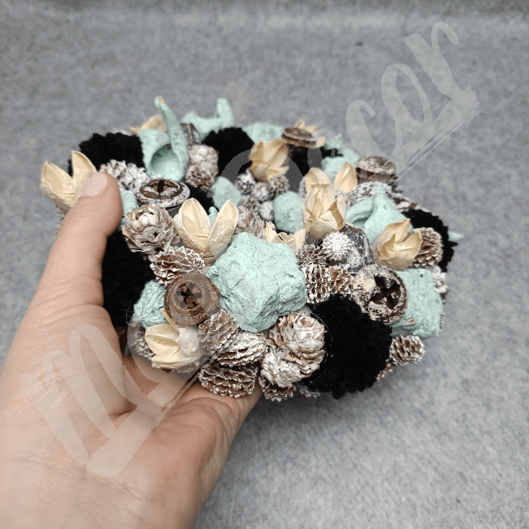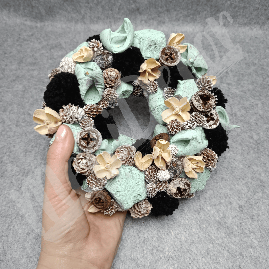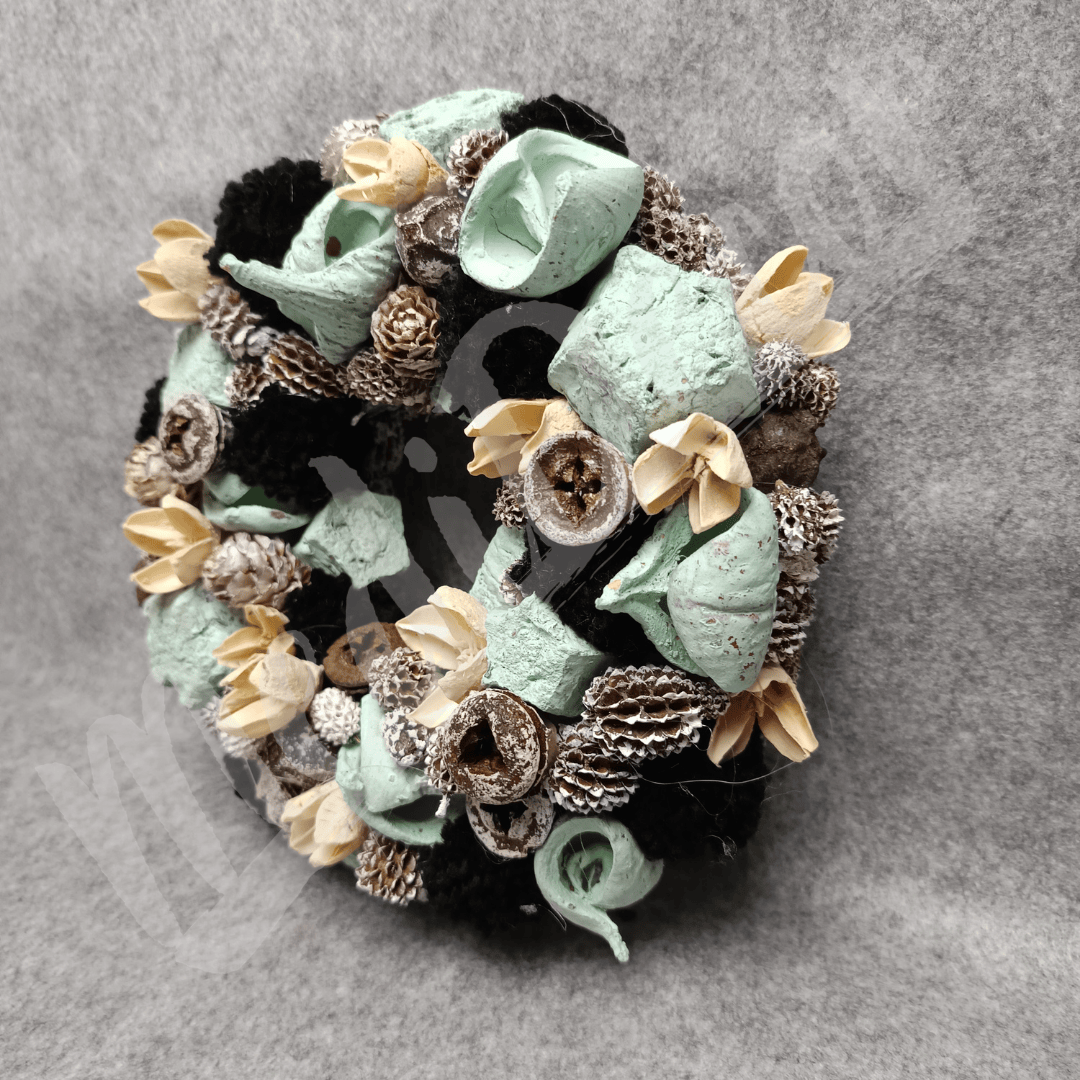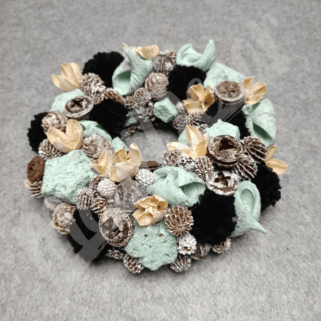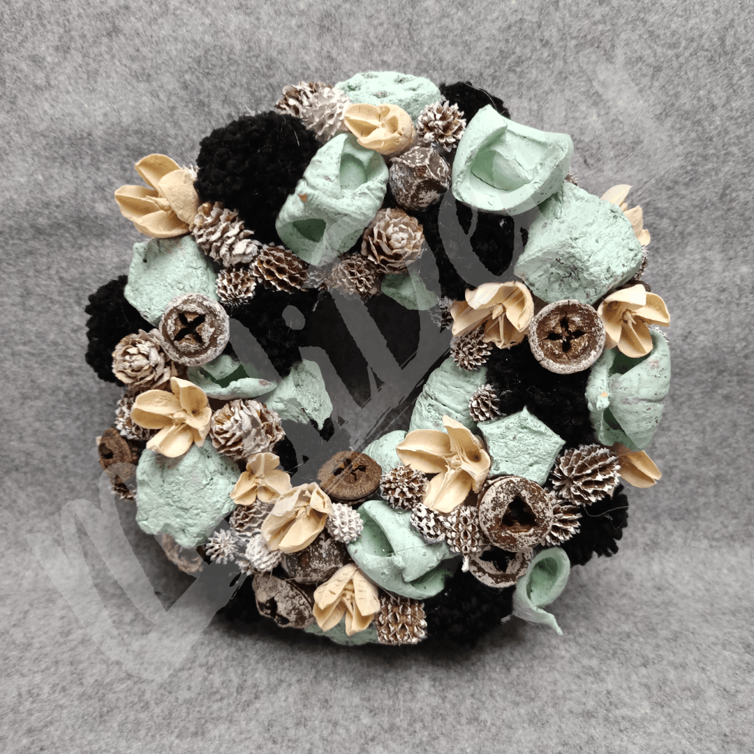 Menta, natúr és fehéres színű termésekkel körberakott koszorú. A termések mellett fekete pomponok is találhatóak benne, így adva kontrasztot a koszorúnak.